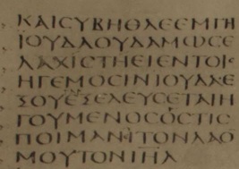 An aside for the attentive observer…  Sinaiticus is an Uncial text.  Uncial texts are characterized by continuous writing (no breaks in the text to differentiate where one word ends and another begins), no punctuation, and most importantly all letters are capitalized.  These features make for a very slow and interesting read.